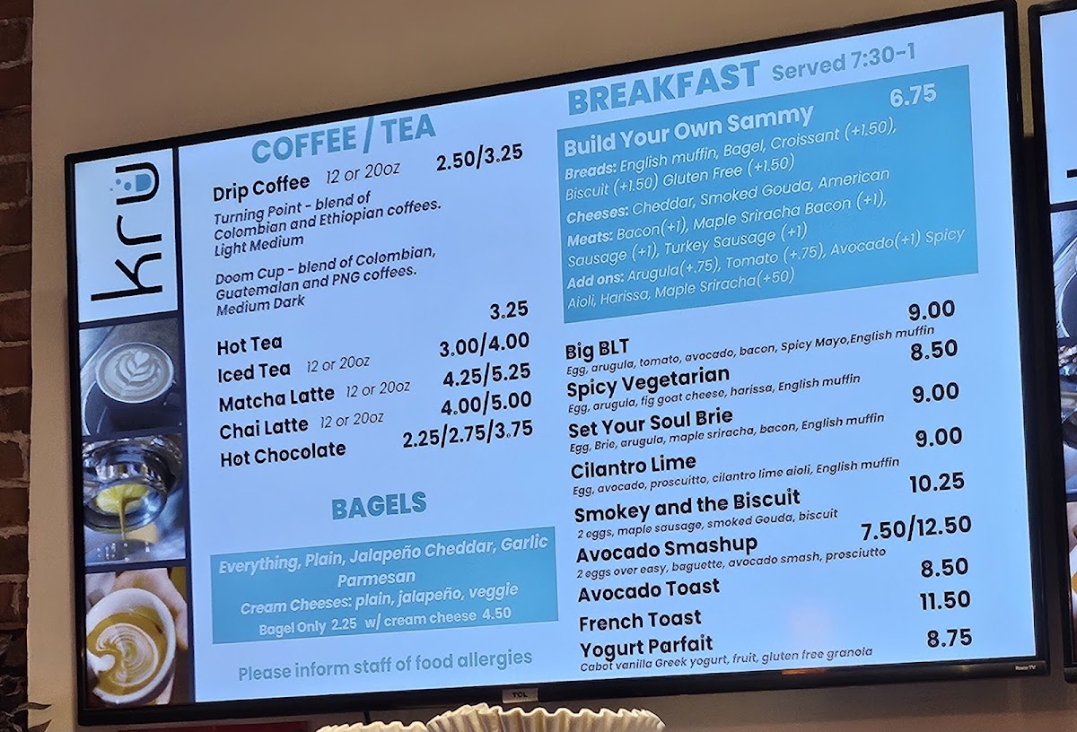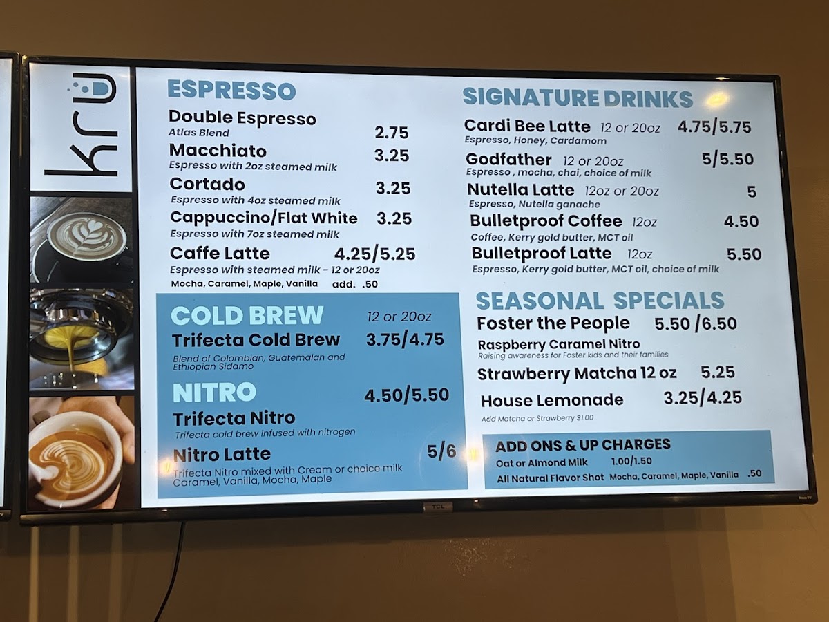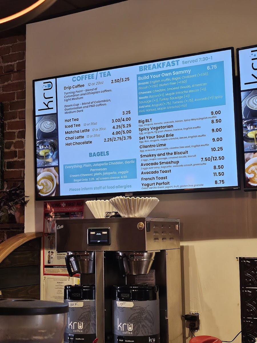 Kru Coffee at 140 Glen St in Glens Falls offers a thoughtfully curated menu that caters to both coffee aficionados and casual visitors alike. Their coffee and tea selection features distinctive options such as Turning Point and Doom Cup, alongside classics like Hot Tea and Iced Tea, with a creamy twist in the Matcha Latte. Breakfast items showcase both hearty and health-conscious choices, including the Big BLT, Spicy Vegetarian, Smokey And The Biscuit, Avocado Smashup, and Avocado Toast, appealing to a range of tastes. Cold brew lovers can enjoy the bold Trifecta Cold Brew, while signature drinks like the Cardi Bee Latte, Godfather, Nutella Latte, Bulletproof Coffee, and Bulletproof Latte elevate the menu with inventive flavors. Seasonal specials such as Toasted Coconut and Almond Joy Nitro offer limited-time indulgences that highlight the café’s creativity. Espresso offerings are robust and precise, from Double Espresso and Macchiato to Cortado, Caffe Latte, and Cappuccino, while nitro options, including Trifecta Nitro and Nitro Latte, provide a modern, smooth alternative. Overall, Kru Coffee’s menu balances classic coffeehouse staples with imaginative beverages and flavorful breakfast options, making it a versatile spot for both daily routines and special treats.