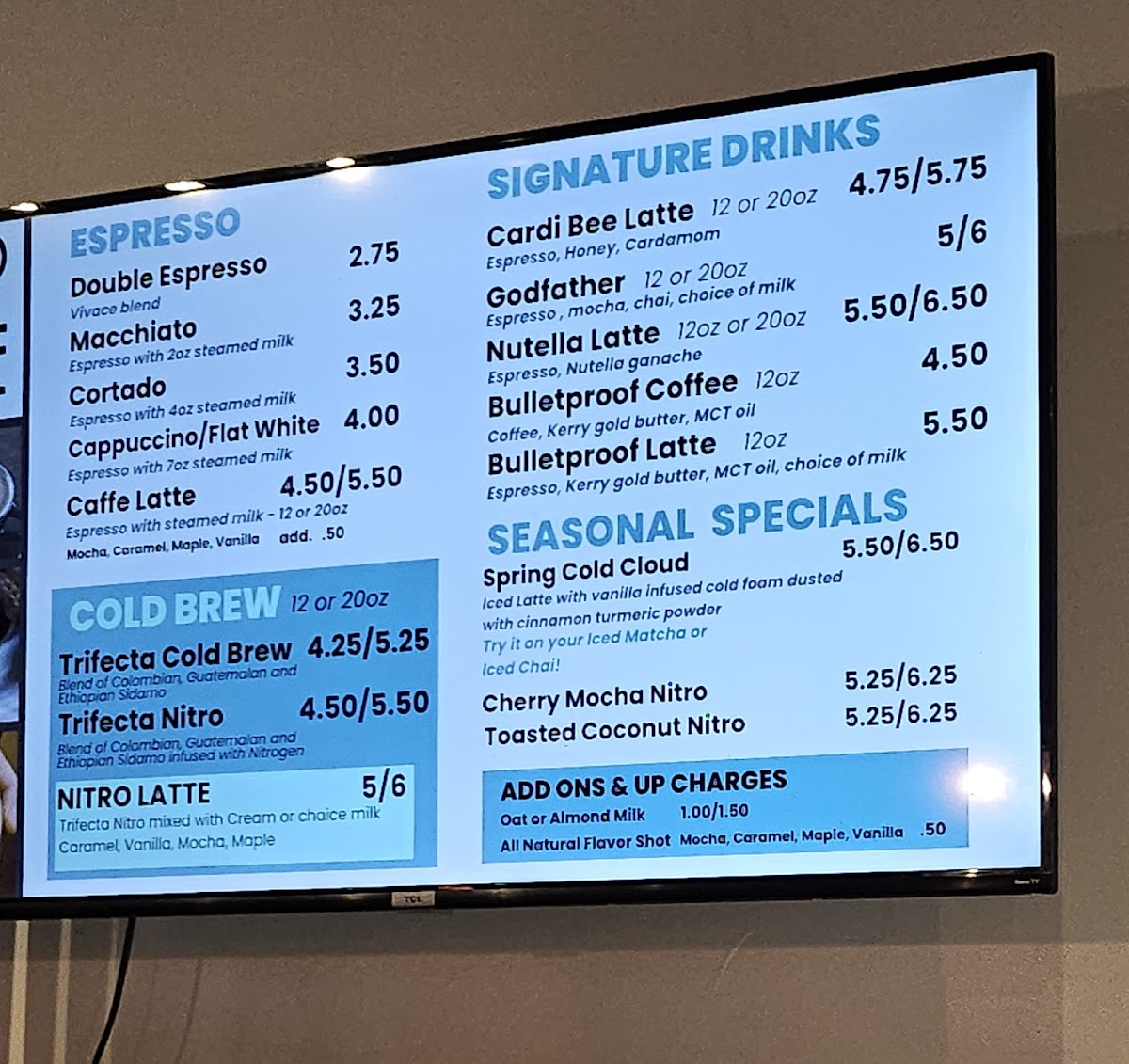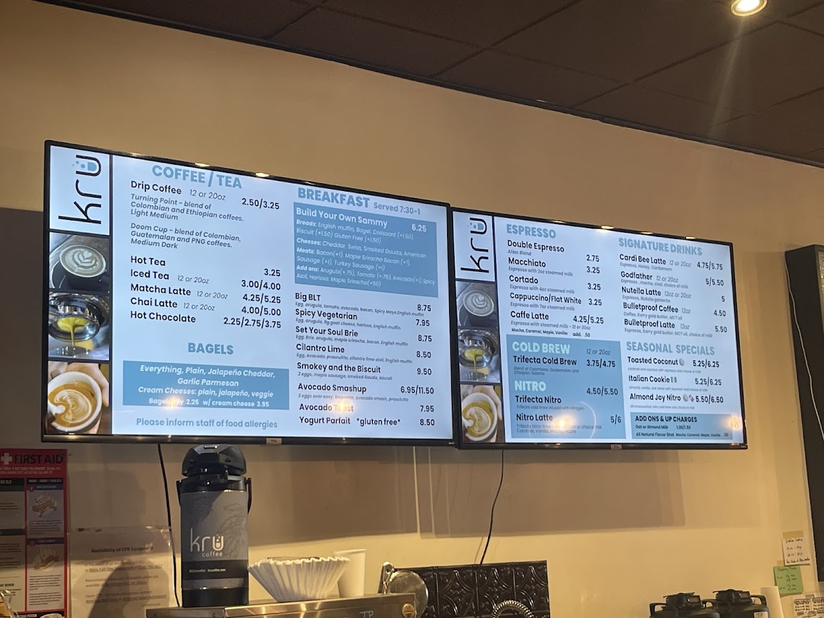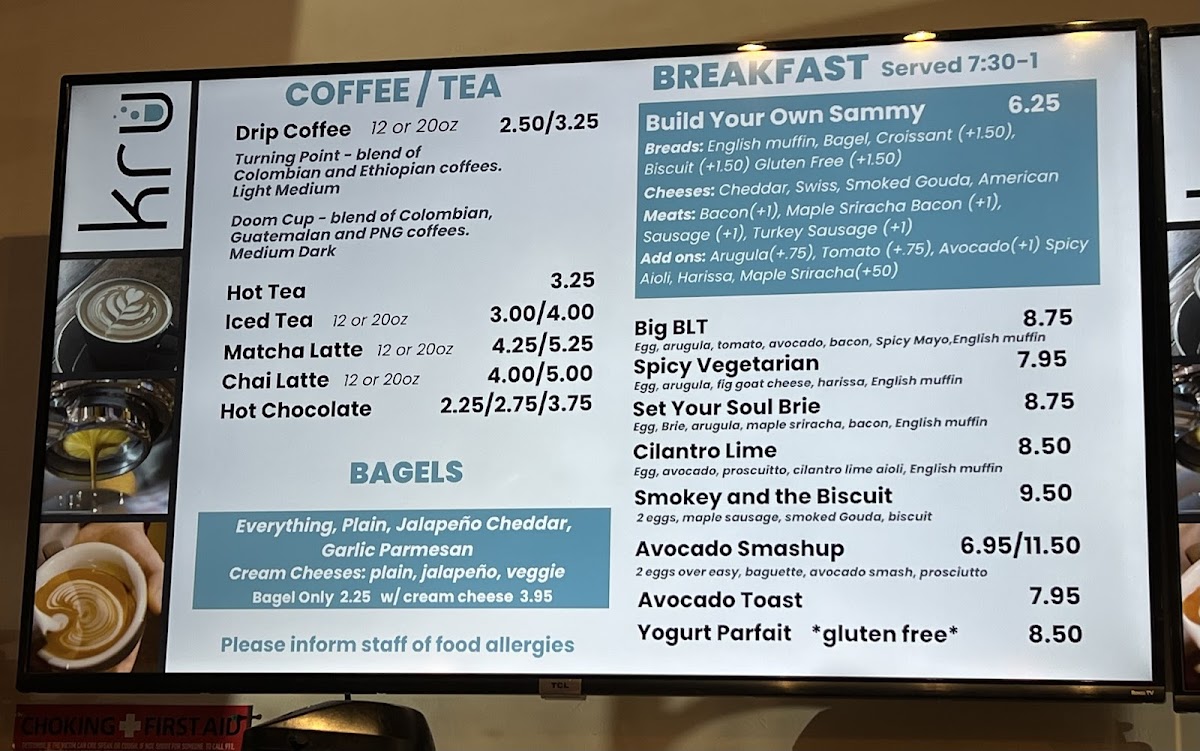 Kru Coffee at 140 Glen St in Glens Falls offers a thoughtfully curated menu that caters to both coffee aficionados and casual visitors alike. Their coffee and tea selection features distinctive options such as Turning Point and Doom Cup, alongside classics like Hot Tea and Iced Tea, with a creamy twist in the Matcha Latte. Breakfast items showcase both hearty and health-conscious choices, including the Big BLT, Spicy Vegetarian, Smokey And The Biscuit, Avocado Smashup, and Avocado Toast, appealing to a range of tastes. Cold brew lovers can enjoy the bold Trifecta Cold Brew, while signature drinks like the Cardi Bee Latte, Godfather, Nutella Latte, Bulletproof Coffee, and Bulletproof Latte elevate the menu with inventive flavors. Seasonal specials such as Toasted Coconut and Almond Joy Nitro offer limited-time indulgences that highlight the café’s creativity. Espresso offerings are robust and precise, from Double Espresso and Macchiato to Cortado, Caffe Latte, and Cappuccino, while nitro options, including Trifecta Nitro and Nitro Latte, provide a modern, smooth alternative. Overall, Kru Coffee’s menu balances classic coffeehouse staples with imaginative beverages and flavorful breakfast options, making it a versatile spot for both daily routines and special treats.